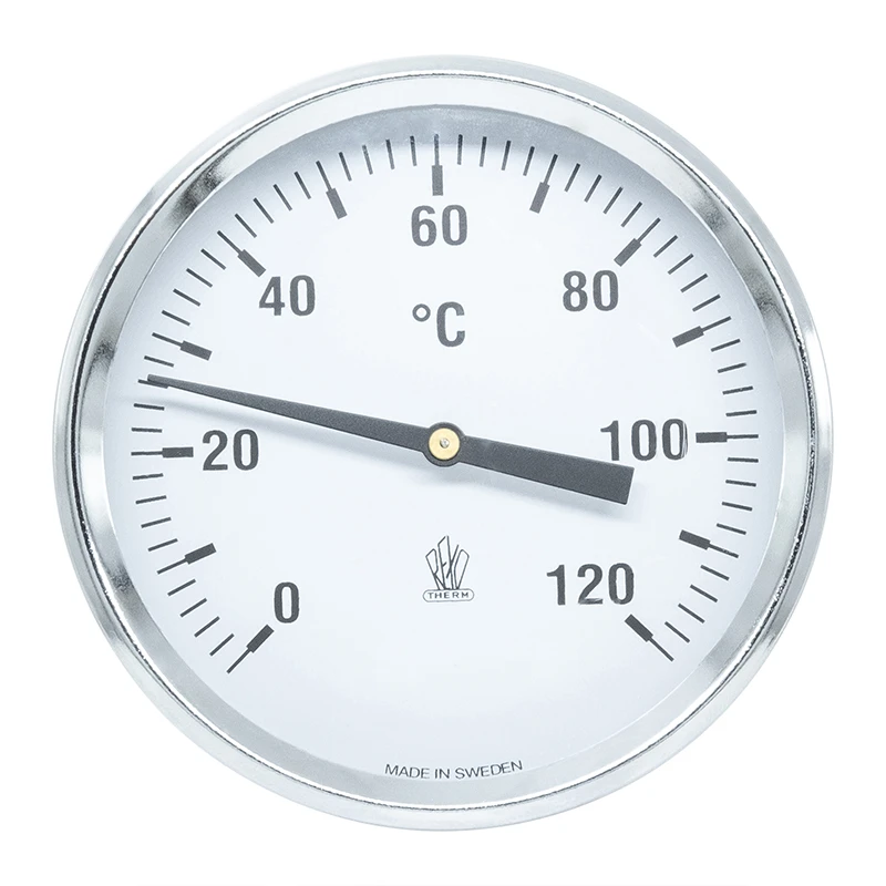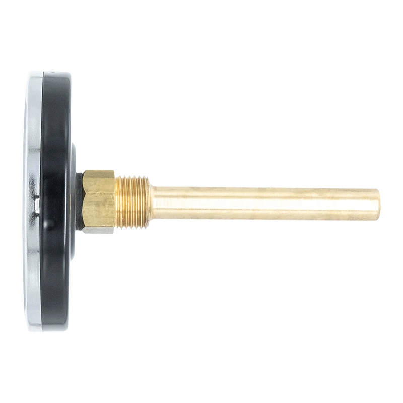 Termometer i normalkapsling med bakåt- respektive nedåtriktad känselkropp, komplett med löstagbart dykrör i mässing alternativt fast känselkropp utan löstagbart dykrör.