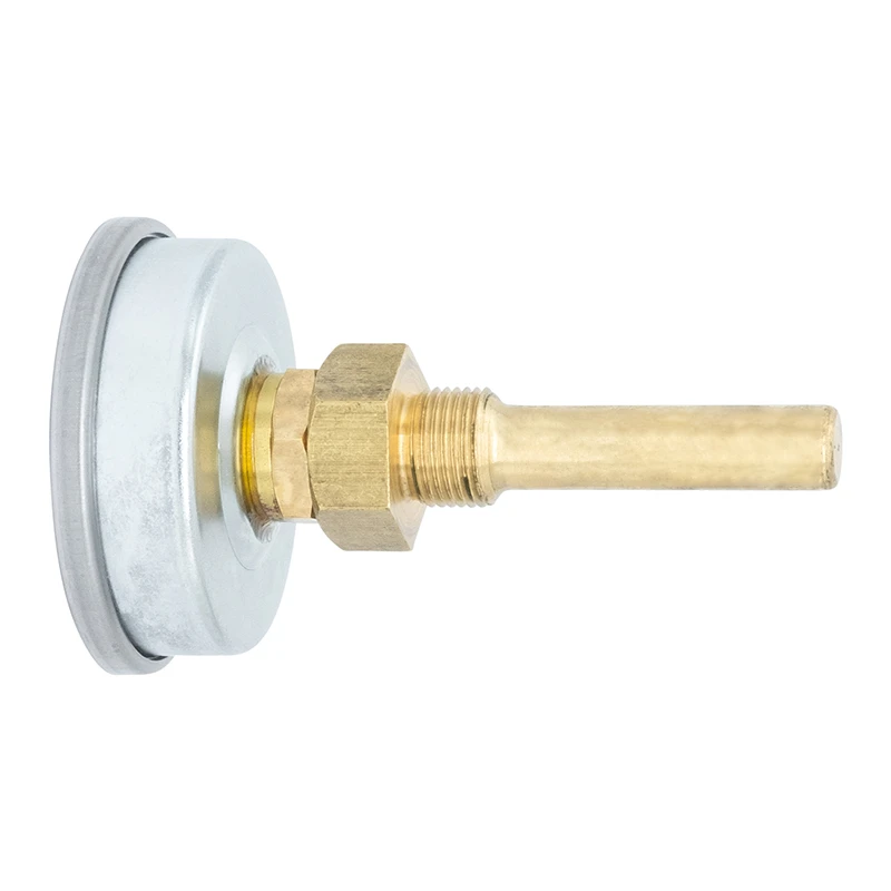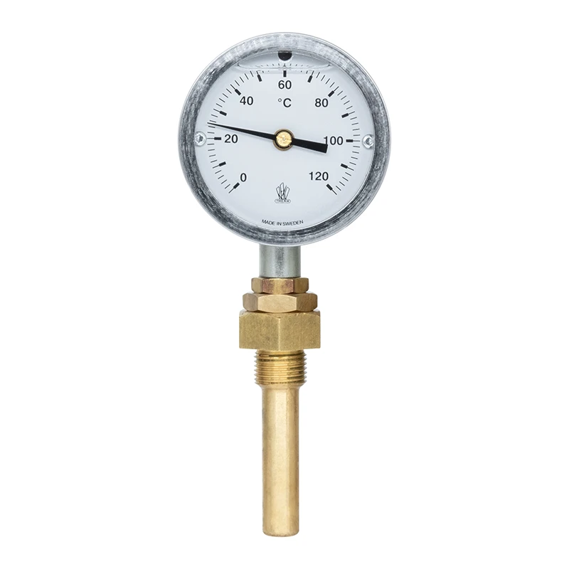 Termometer med bakåt- respektive nedåtriktad känselkropp, komplett med löstagbart dykrör i avzinkningshärdig mässing. Finns även med dykrör i syrafast utförande.